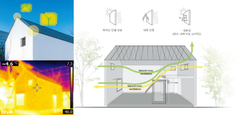 대형패널을 이용하여 제작되기 때문에 연결부가 최소화되고 열교 (Thermal Bridge)가 없도록 시공이 가능합니다.
