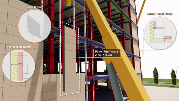외장마감일체형 대형보드(2.7mX9.0m)는 공사기간을 단축하고, 외부 가설비계 설치가 필요하지 않아, 안전하고 빠른 시공이 가능합니다.
